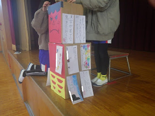 明日の節分にちなんで、今日は全校で節分集会をしました。児童会運営のもと、節分クイズや節分ゲームをしました。節分クイズでは、なかなかの難問だったようです。節分ゲームでは、3つのゲームがありました。初めは、子どもたちが、自身の中にある「鬼(弱さ)」を書いた短冊を鬼に見立てた段ボールに貼り、それを的にして玉を当て、鬼(段ボール)を倒すというもの。2つ目は、体に粘着テープを張った高学年の子にふわふわの玉を投げて、それを体に引っ付けることができたらポイントゲットというもの。最後は、3体の鬼の登場。赤鬼、青鬼、ボス鬼が粥見、神殿、赤桶からやってきました。動き回る3体の鬼に玉を当てたらポイントというものでした。鬼の正体は、最後まで明かさないということでしたが、子どもたちには、簡単に見破られていたようです。ご協力ありがとうございました。